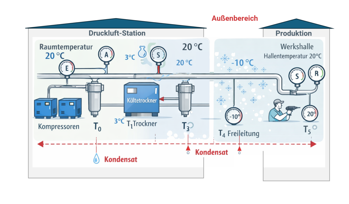 Wasserlast aus Ansaugluft → Verdichtung → Trockner → Freileitung (Praxis-Modell)